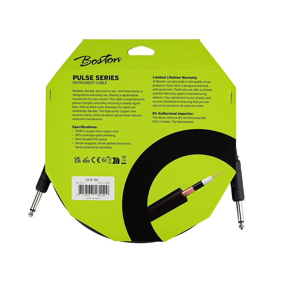 Boston Pulse-sarjan instrumenttikaapelit on rakennettu soittajille, jotka haluavat kestäviä, luotettavia ja joustavia kaapeleita. Päivittäiseen käyttöön suunniteltu Pulse-sarja on varustettu erittäin puhtaalla happivapaalla kupariytimellä, jonka ympärille on punottu tiheä spiraalisuojaus puhdasta ja selkeää signaalia sekä mahdollisimman suurta häiriönsuojausta varten. Joustava rakenne ehkäisee kaapelin kiertymistä ja sotkeutumista, kun taas tukeva 8mm PVC-kuori tekee johdosta kestävän ilman ylimääräistä jäykkyyttä.