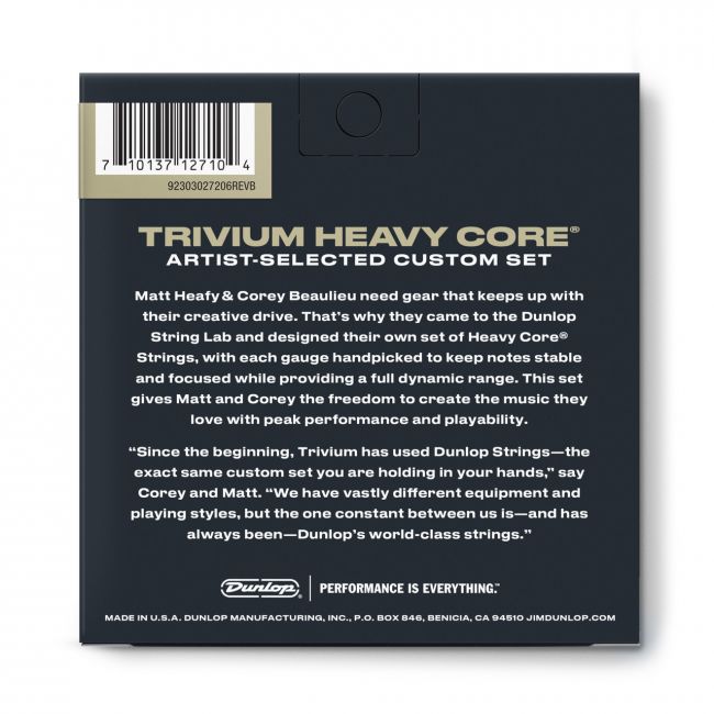 Dunlop Heavy Core -sarjan kielissä on erityinen punoksen ja ytimen paksuuden välinen suhde. Rakenne toimii normaalissakin vireessä, mutta sen edut tulevat esiin erityisesti alavireillä. Ääni pysyy tiukkana ja selkeänä. Soittotuntuma ei kärsi alavireestä vaan pitää ryhtinsä ja nopeutensa.