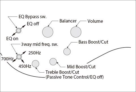 - Ibanezin aktiivinen etuaste aktiivi- / passiivikytkimellä ja passiivisella tone-nupilla